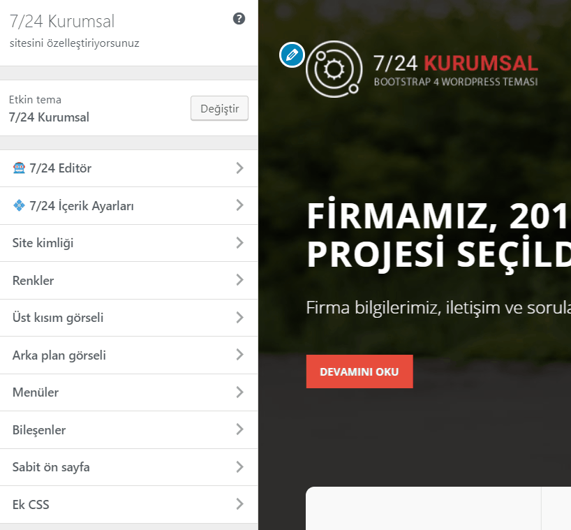 Bu alandan tema üzerinde bulunan ana renkleri değiştirebilirsiniz.Eğer değiştirmek istediğiniz alan 7/24 Editör'de yok ise, bize belirtmeniz durumunda sizin için güncelleyebiliriz.