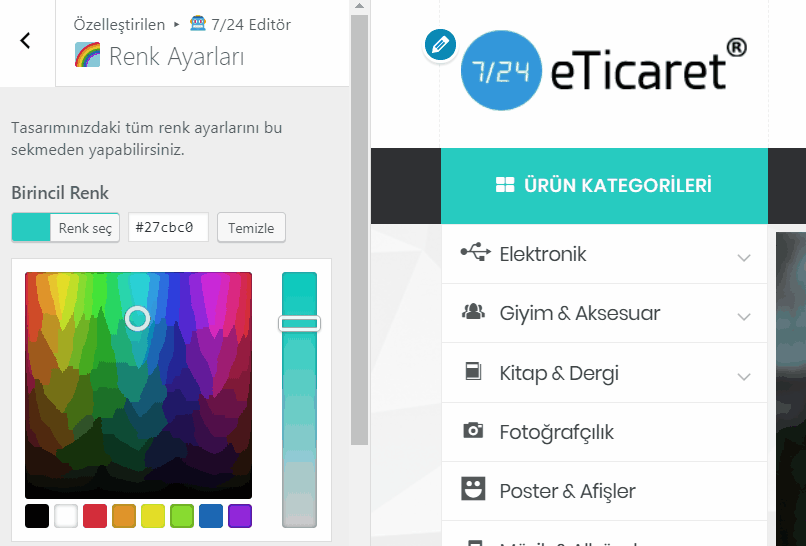 Sitenizde bulunan renkleri bu sekmeden yönetebilirsiniz.Renk paleti ile markanızı saniyeler içinde sitenize yansıtın!
