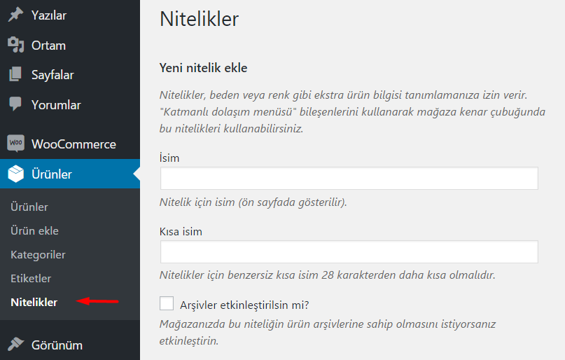 Nitelikler, ürünlerin renk/boy gibi özelliklerini belirtmek ve aynı zamanda bunlara ayrı fiyatlar sunmak için kullanılır.Nitelikleri yönetmek için Ürünler > Nitelikler alanına bakabilirsiniz.